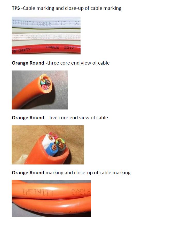 - All Infinity Orange Round -All sizes and configurations of ‘Polymeric Insulated Electrical Cable and which is PVC Sheathed, PVC Insulated, Round and Flexible Low Voltage Electrical Cable’ also commonly known as ‘Orange Round’ imported and sold by Infinity Cable Co Pty Ltd.The recall was limited to the three batches of the TPS cable only. Those batch numbers were INFH 190311, INFH 210912 and INFMEL 081112.All TPS and Orange Round Cable sold by Infinity Cable Co Pty Ltd are branded with the words ‘Infinity’.
